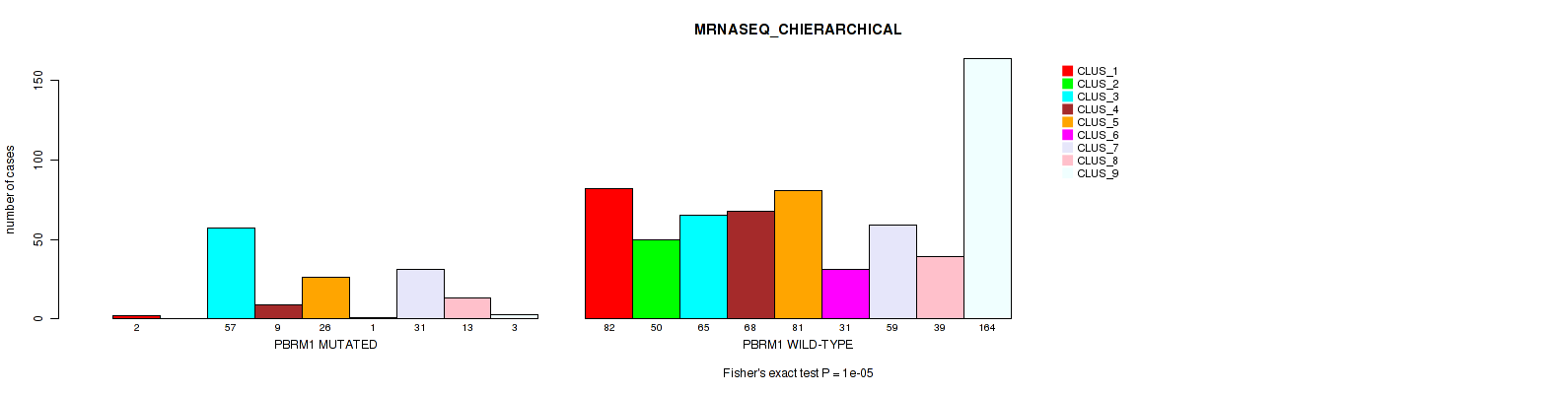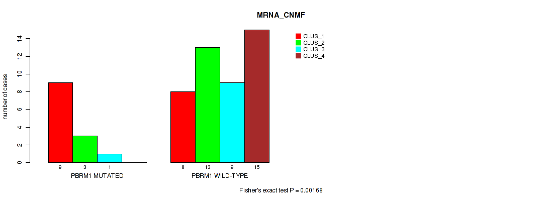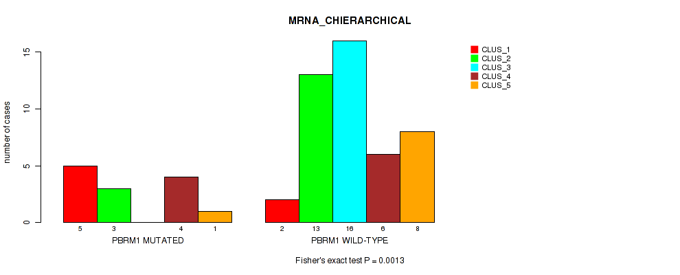 PBRM1 mutation correlated to 'MRNA_CNMF', 'MRNA_CHIERARCHICAL', 'CN_CNMF', 'METHLYATION_CNMF', 'RPPA_CNMF', 'RPPA_CHIERARCHICAL', 'MRNASEQ_CNMF', 'MRNASEQ_CHIERARCHICAL', 'MIRSEQ_CNMF', 'MIRSEQ_CHIERARCHICAL', 'MIRSEQ_MATURE_CNMF', and 'MIRSEQ_MATURE_CHIERARCHICAL'.