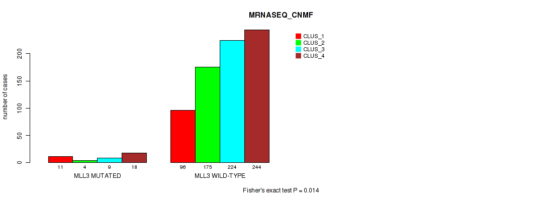 MLL3 mutation correlated to 'MRNASEQ_CNMF' and 'MIRSEQ_CHIERARCHICAL'.