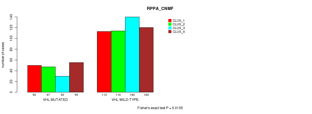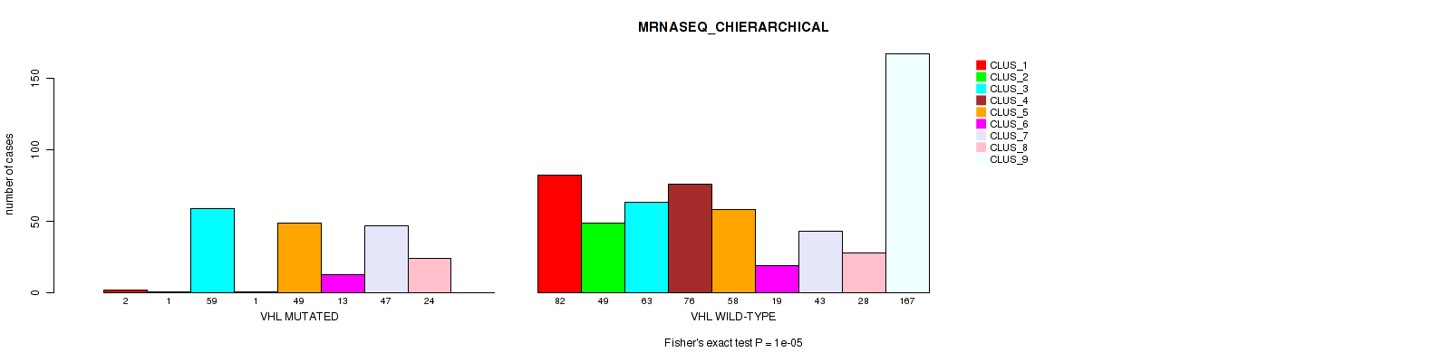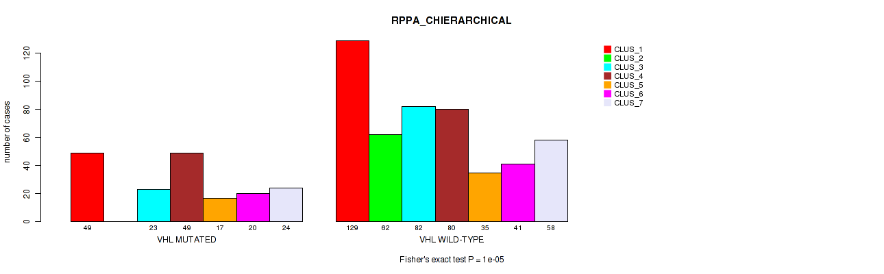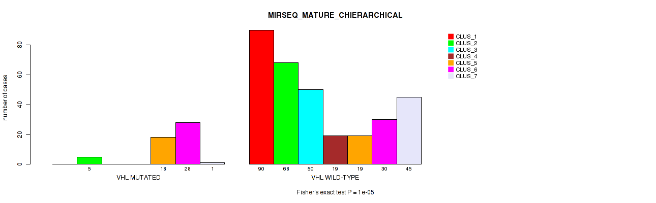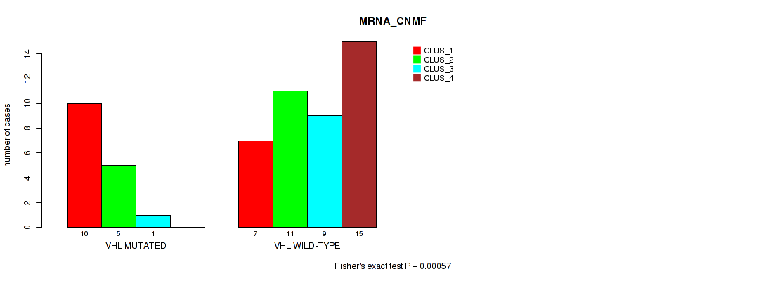 VHL mutation correlated to 'MRNA_CNMF', 'MRNA_CHIERARCHICAL', 'CN_CNMF', 'METHLYATION_CNMF', 'RPPA_CNMF', 'RPPA_CHIERARCHICAL', 'MRNASEQ_CNMF', 'MRNASEQ_CHIERARCHICAL', 'MIRSEQ_CNMF', 'MIRSEQ_CHIERARCHICAL', 'MIRSEQ_MATURE_CNMF', and 'MIRSEQ_MATURE_CHIERARCHICAL'.
