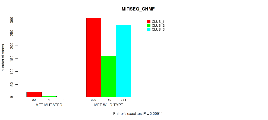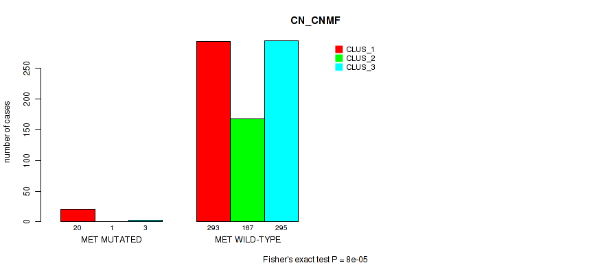 MET mutation correlated to 'CN_CNMF', 'METHLYATION_CNMF', 'MRNASEQ_CNMF', 'MRNASEQ_CHIERARCHICAL', 'MIRSEQ_CNMF', 'MIRSEQ_CHIERARCHICAL', 'MIRSEQ_MATURE_CNMF', and 'MIRSEQ_MATURE_CHIERARCHICAL'.