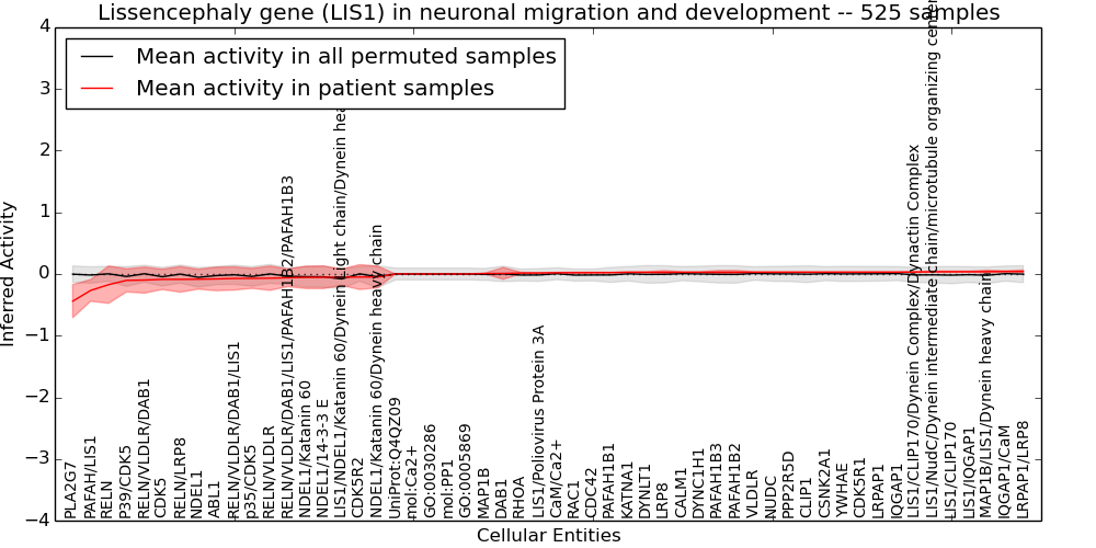 Figure S130. Get High-res Image This plot shows pathway concept perturbations across all samples against a permutation model. The concepts along the x-axis are sorted by lowest to highest mean activity for the real patient samples. Mean inferred activities are plotted along the y-axis as a colored band showing the average level and one standard deviation range. Real samples are shown in red and permuted samples in black.