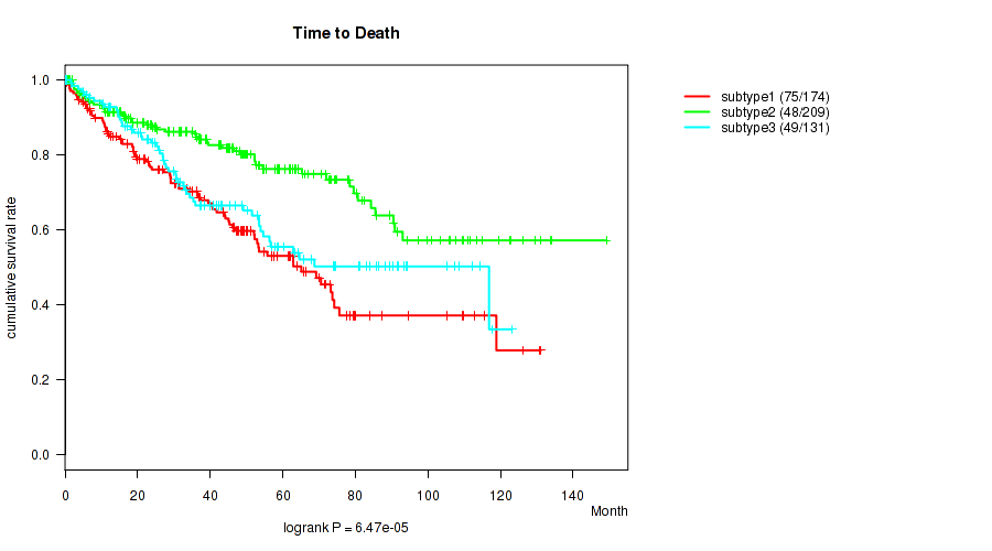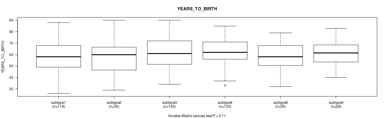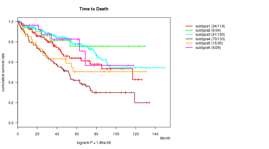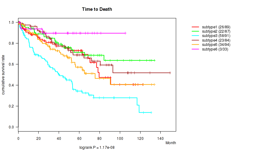 Consensus hierarchical clustering analysis on sequencing-based mRNA expression data identified 6 subtypes that correlate to 'Time to Death', 'PATHOLOGIC_STAGE', 'PATHOLOGY_T_STAGE', 'PATHOLOGY_N_STAGE', 'PATHOLOGY_M_STAGE', 'GENDER', 'KARNOFSKY_PERFORMANCE_SCORE', and 'RACE'.