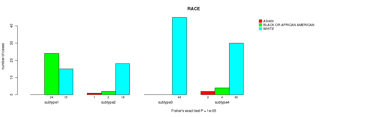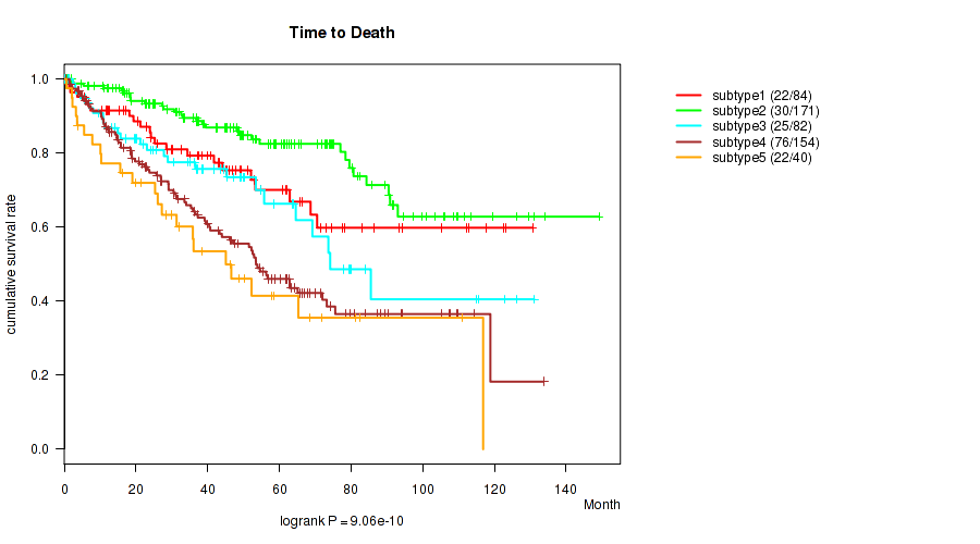 CNMF clustering analysis on sequencing-based mRNA expression data identified 5 subtypes that correlate to 'Time to Death', 'PATHOLOGIC_STAGE', 'PATHOLOGY_T_STAGE', 'PATHOLOGY_N_STAGE', 'PATHOLOGY_M_STAGE', 'GENDER', and 'RACE'.