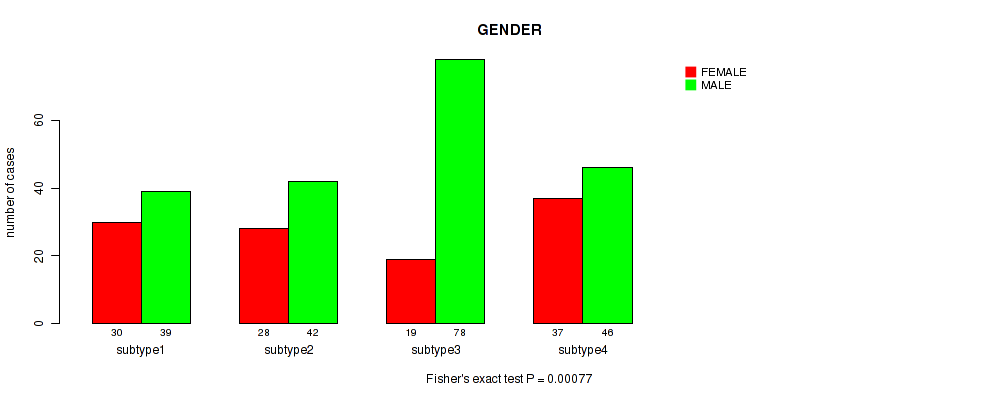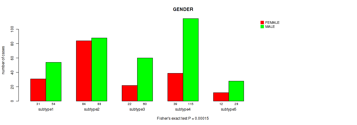 Table S141. Clustering Approach #12: 'MIRseq Mature cHierClus subtypes' versus Clinical Feature #7: 'GENDER'