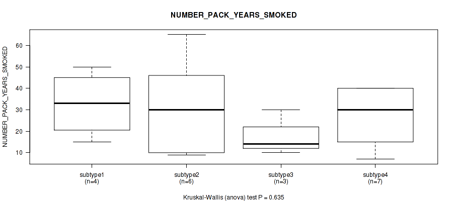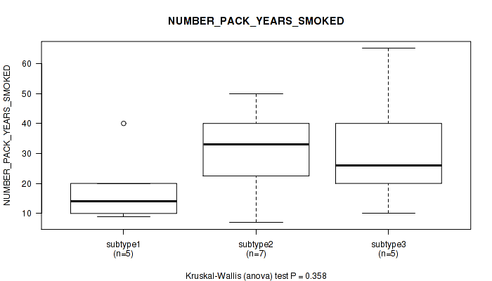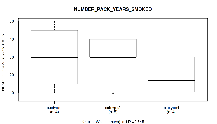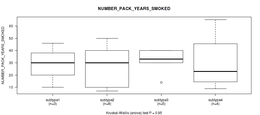 Table S143. Clustering Approach #12: 'MIRseq Mature cHierClus subtypes' versus Clinical Feature #9: 'NUMBER_PACK_YEARS_SMOKED'