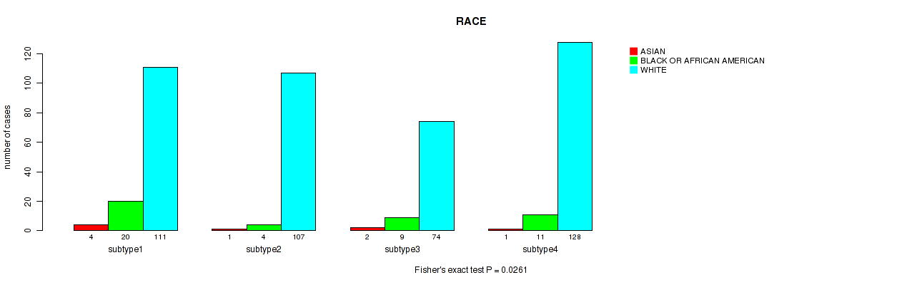 4 subtypes identified in current cancer cohort by 'MIRseq Mature cHierClus subtypes'. These subtypes correlate to 'PATHOLOGIC_STAGE', 'PATHOLOGY_T_STAGE', 'GENDER', and 'RACE'.