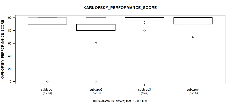 Table S142. Clustering Approach #12: 'MIRseq Mature cHierClus subtypes' versus Clinical Feature #8: 'KARNOFSKY_PERFORMANCE_SCORE'