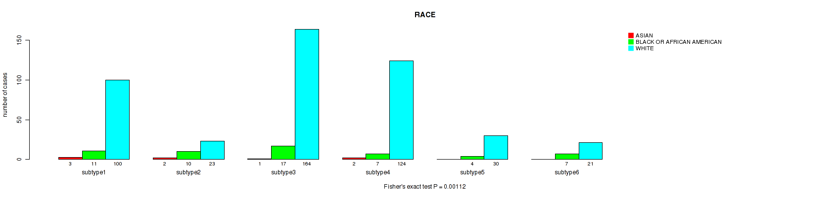 Table S144. Clustering Approach #12: 'MIRseq Mature cHierClus subtypes' versus Clinical Feature #11: 'RACE'