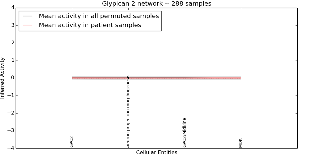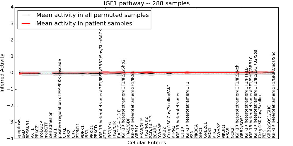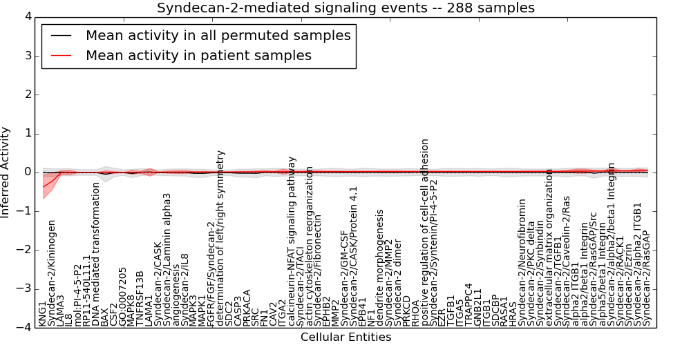 Figure S131.  Get High-res Image This plot shows pathway concept perturbations across all samples against a permutation model. The concepts along the x-axis are sorted by lowest to highest mean activity for the real patient samples. Mean inferred activities are plotted along the y-axis as a colored band showing the average level and one standard deviation range. Real samples are shown in red and permuted samples in black.