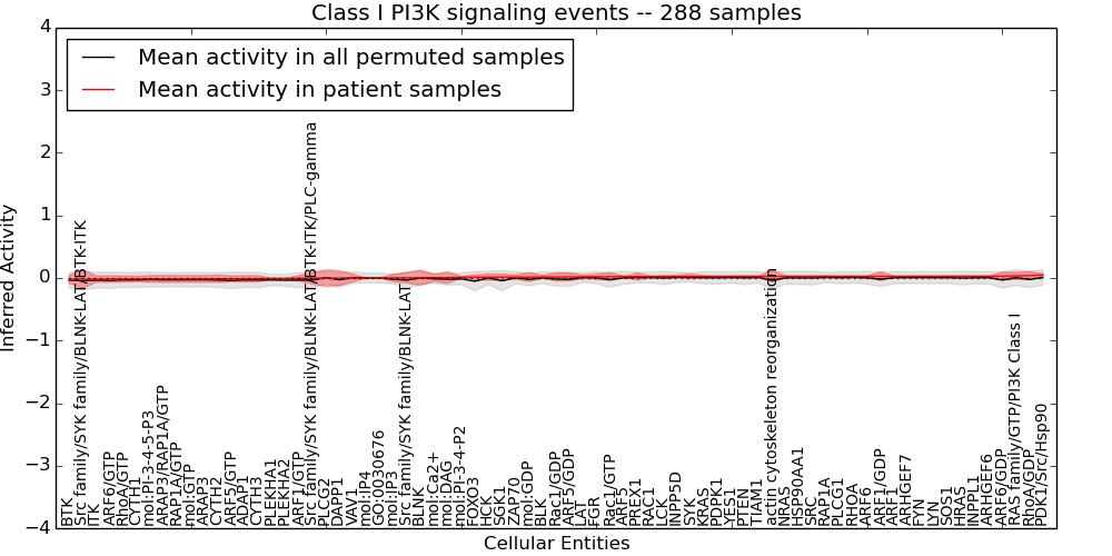 Figure S130.  Get High-res Image This plot shows pathway concept perturbations across all samples against a permutation model. The concepts along the x-axis are sorted by lowest to highest mean activity for the real patient samples. Mean inferred activities are plotted along the y-axis as a colored band showing the average level and one standard deviation range. Real samples are shown in red and permuted samples in black.