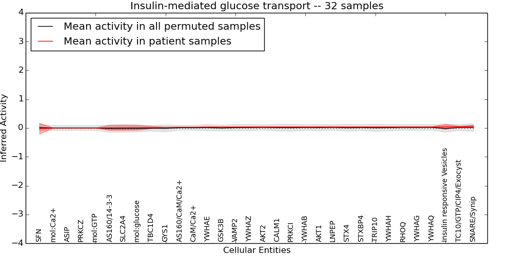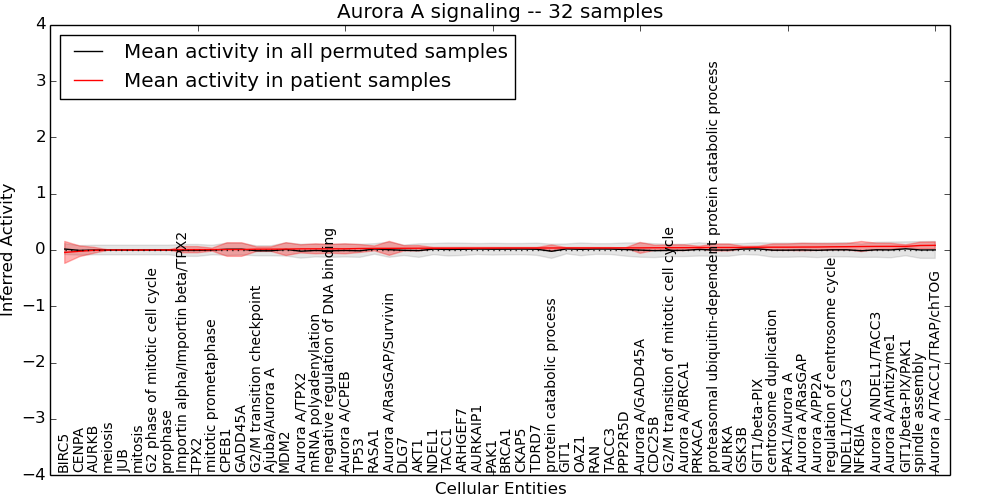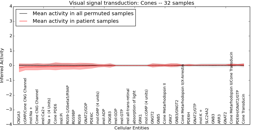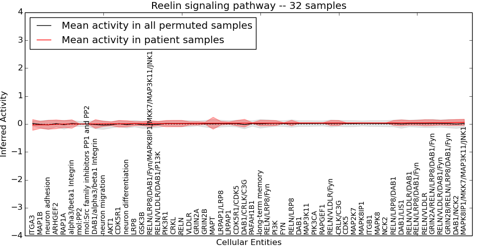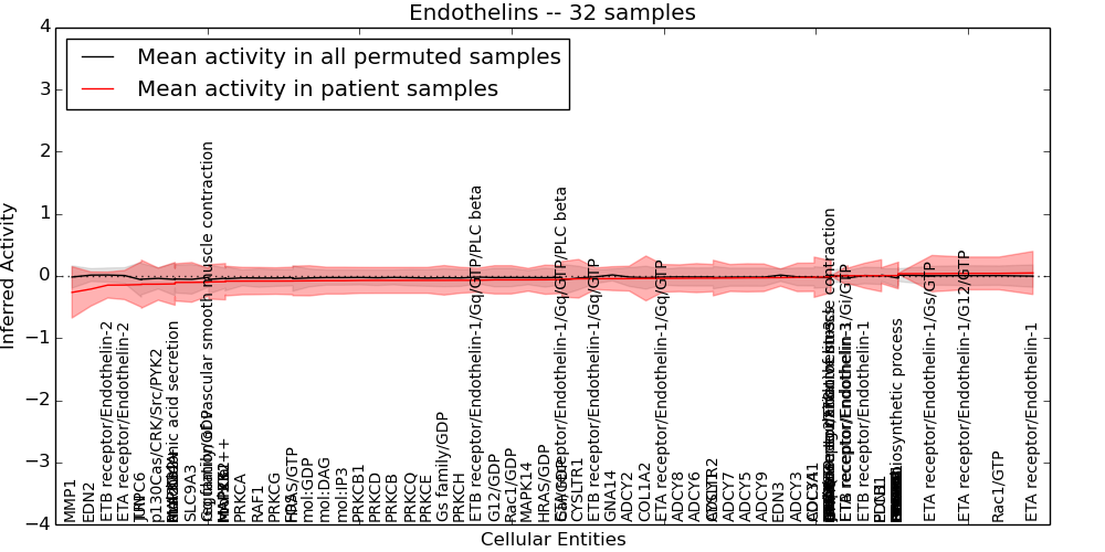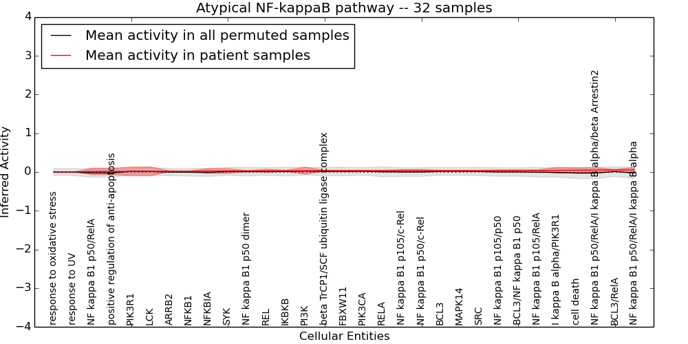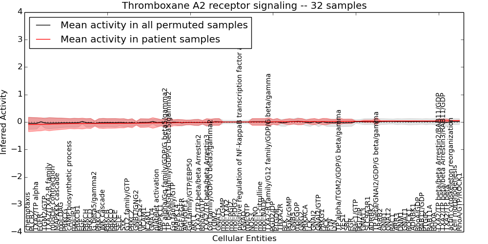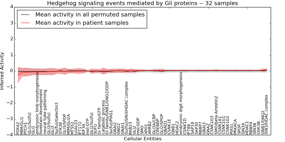 Figure S131. Get High-res Image This plot shows pathway concept perturbations across all samples against a permutation model. The concepts along the x-axis are sorted by lowest to highest mean activity for the real patient samples. Mean inferred activities are plotted along the y-axis as a colored band showing the average level and one standard deviation range. Real samples are shown in red and permuted samples in black.