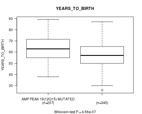 Table S12. Gene #19: 'amp_12q15' versus Clinical Feature #2: 'YEARS_TO_BIRTH'