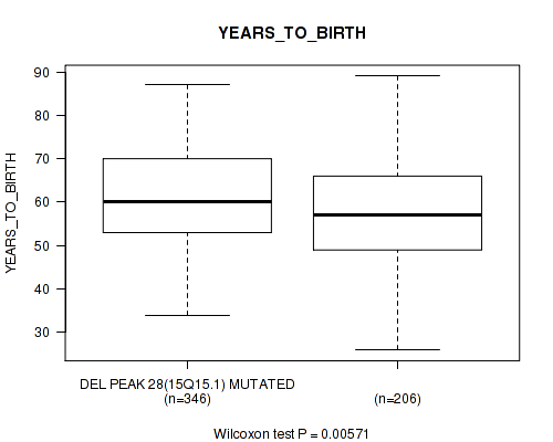 Table S26. Gene #61: 'del_15q15.1' versus Clinical Feature #2: 'YEARS_TO_BIRTH'