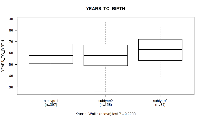 Consensus hierarchical clustering analysis on array-based mRNA expression data identified 3 subtypes that correlate to 'YEARS_TO_BIRTH'.