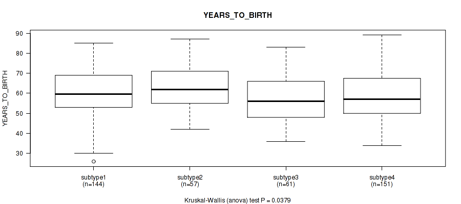 4 subtypes identified in current cancer cohort by 'MIRSEQ CHIERARCHICAL'. These subtypes correlate to 'YEARS_TO_BIRTH'.