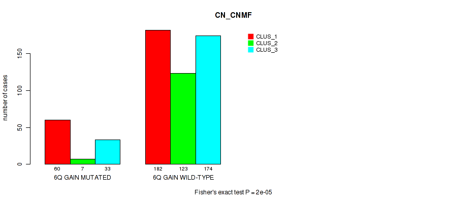 6q gain cnv correlated to 'MRNA_CNMF', 'MIR_CHIERARCHICAL', 'CN_CNMF', 'METHLYATION_CNMF', 'MIRSEQ_CHIERARCHICAL', and 'MIRSEQ_MATURE_CNMF'.
