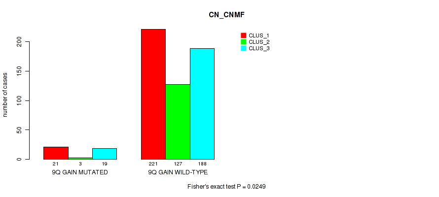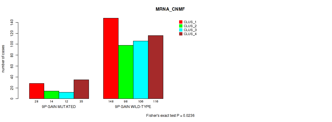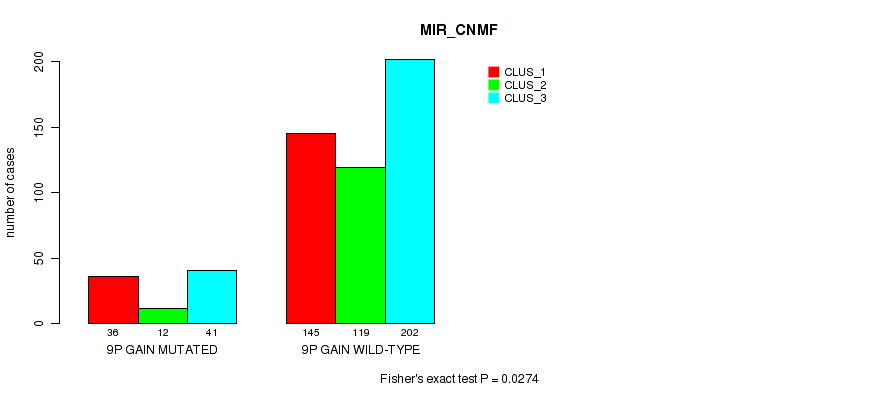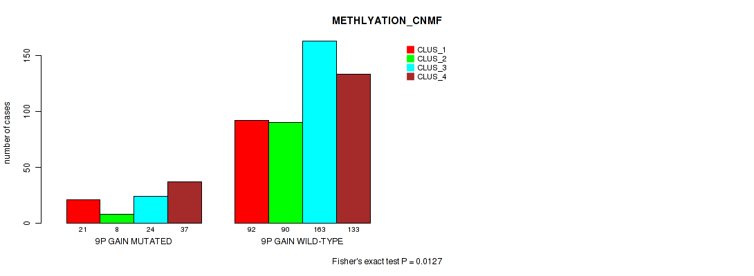 9p gain cnv correlated to 'MRNA_CNMF', 'MIR_CNMF', 'CN_CNMF', and 'METHLYATION_CNMF'.
