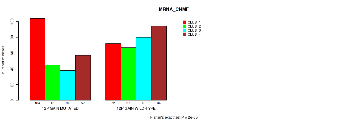 12p gain cnv correlated to 'MRNA_CNMF', 'MRNA_CHIERARCHICAL', 'MIR_CHIERARCHICAL', 'CN_CNMF', 'METHLYATION_CNMF', 'MRNASEQ_CNMF', 'MRNASEQ_CHIERARCHICAL', and 'MIRSEQ_CHIERARCHICAL'.