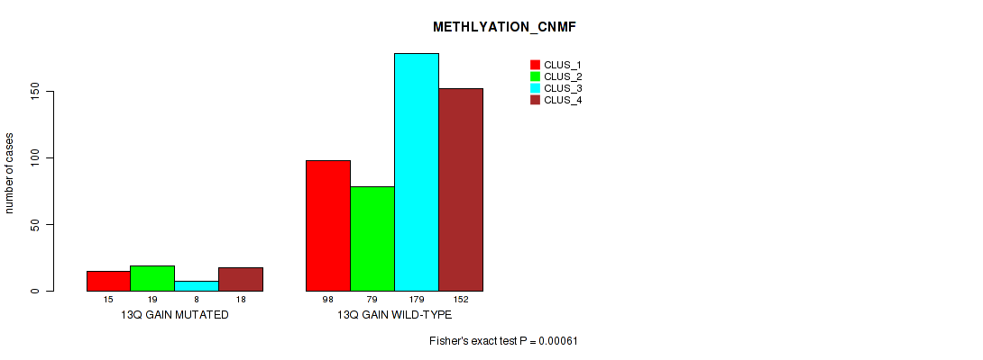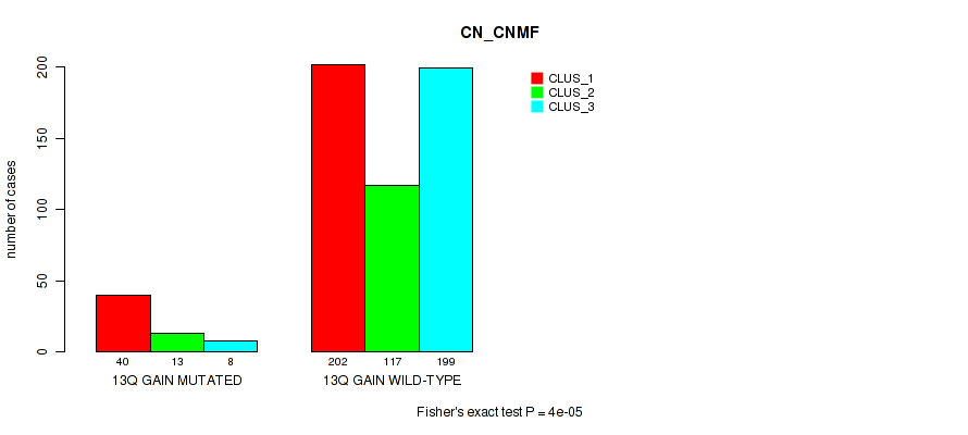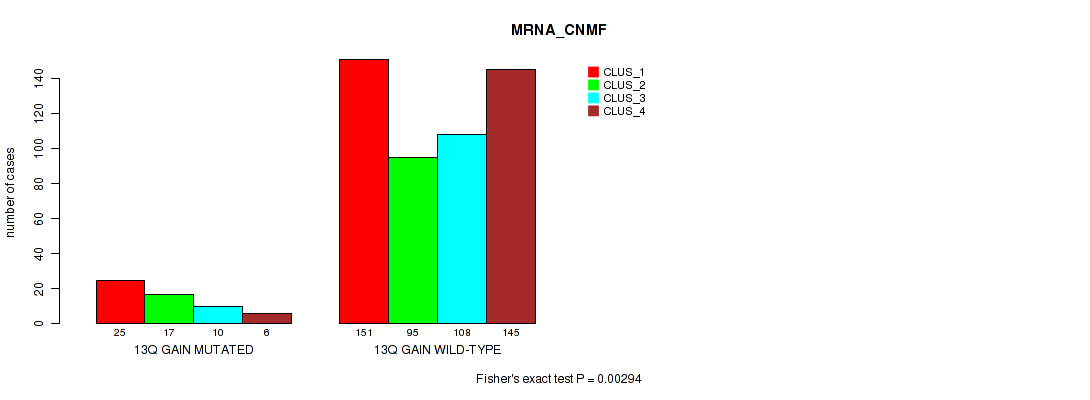 13q gain cnv correlated to 'MRNA_CNMF', 'MRNA_CHIERARCHICAL', 'MIR_CHIERARCHICAL', 'CN_CNMF', 'METHLYATION_CNMF', and 'MRNASEQ_CNMF'.