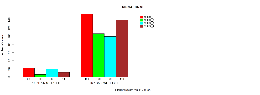 16p gain cnv correlated to 'MRNA_CNMF' and 'MRNA_CHIERARCHICAL'.