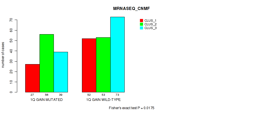 1q gain cnv correlated to 'CN_CNMF', 'METHLYATION_CNMF', 'MRNASEQ_CNMF', 'MRNASEQ_CHIERARCHICAL', 'MIRSEQ_CHIERARCHICAL', and 'MIRSEQ_MATURE_CNMF'.