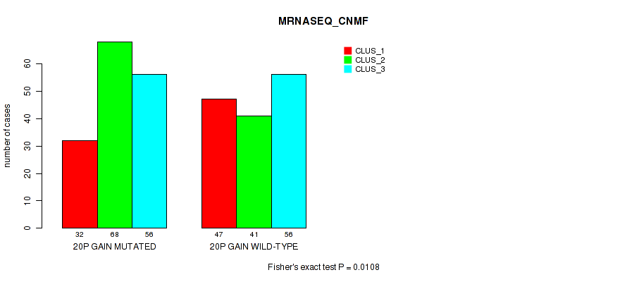 20p gain cnv correlated to 'MRNA_CNMF', 'MRNA_CHIERARCHICAL', 'MIR_CHIERARCHICAL', 'CN_CNMF', 'METHLYATION_CNMF', 'MRNASEQ_CNMF', 'MRNASEQ_CHIERARCHICAL', and 'MIRSEQ_CHIERARCHICAL'.