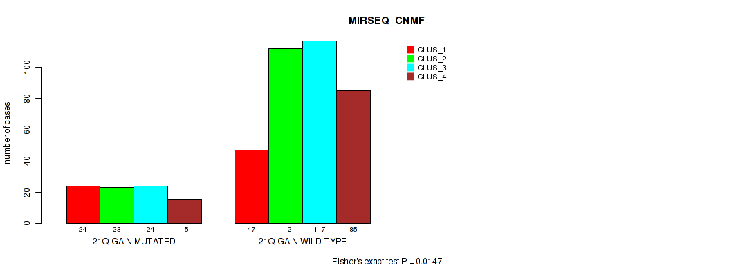 21q gain cnv correlated to 'CN_CNMF', 'METHLYATION_CNMF', and 'MIRSEQ_CNMF'.