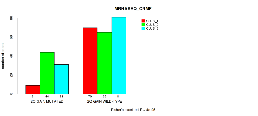 2q gain cnv correlated to 'MRNA_CNMF', 'MRNA_CHIERARCHICAL', 'MIR_CHIERARCHICAL', 'CN_CNMF', 'METHLYATION_CNMF', 'MRNASEQ_CNMF', 'MRNASEQ_CHIERARCHICAL', and 'MIRSEQ_CHIERARCHICAL'.