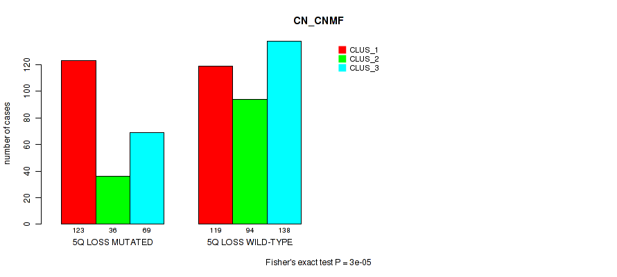 5q loss cnv correlated to 'MRNA_CNMF', 'MRNA_CHIERARCHICAL', 'MIR_CHIERARCHICAL', 'CN_CNMF', 'METHLYATION_CNMF', 'MRNASEQ_CNMF', 'MRNASEQ_CHIERARCHICAL', and 'MIRSEQ_CHIERARCHICAL'.