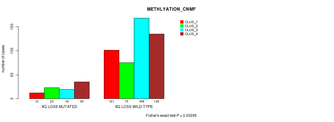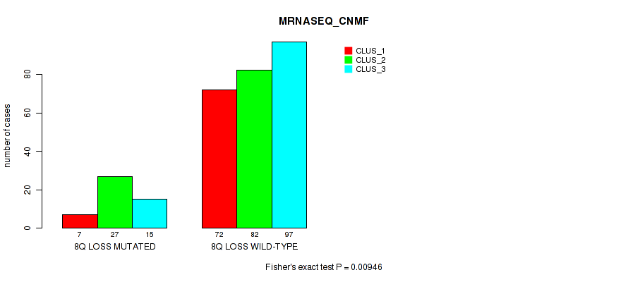 8q loss cnv correlated to 'MRNA_CNMF', 'MRNA_CHIERARCHICAL', 'CN_CNMF', 'METHLYATION_CNMF', 'MRNASEQ_CNMF', 'MRNASEQ_CHIERARCHICAL', and 'MIRSEQ_CHIERARCHICAL'.
