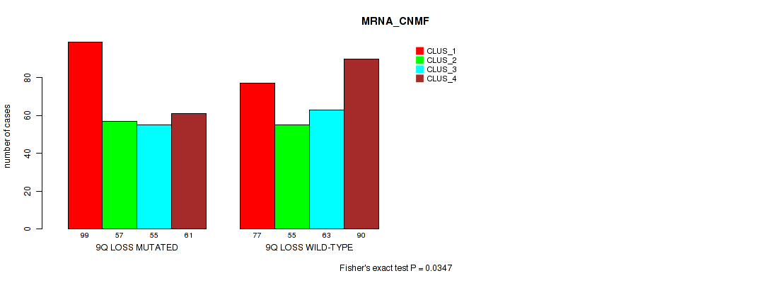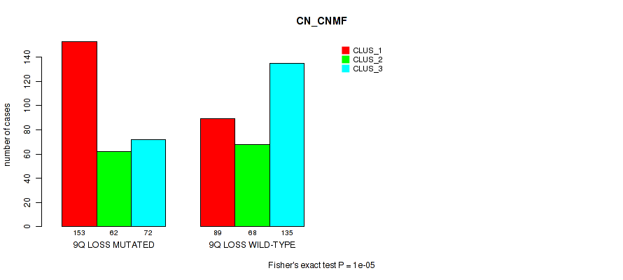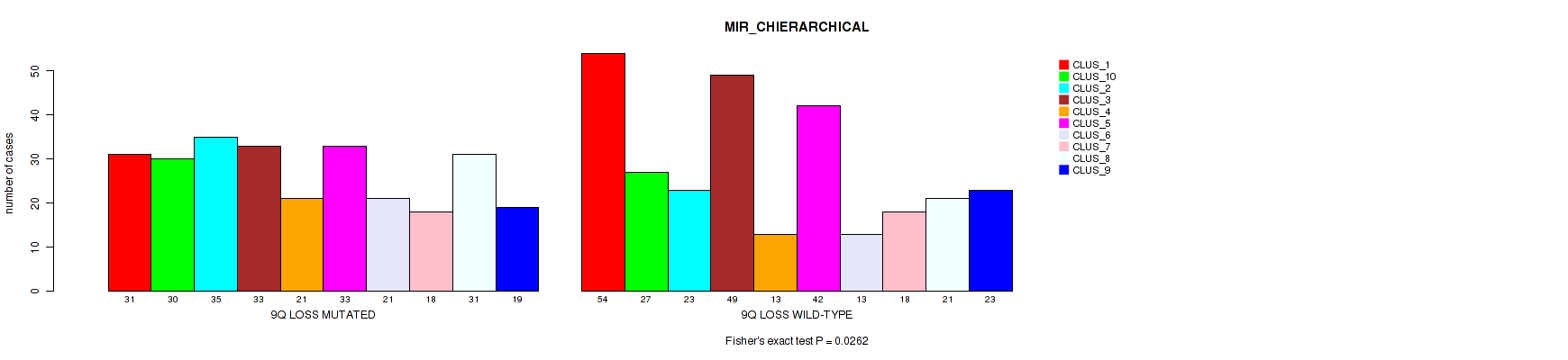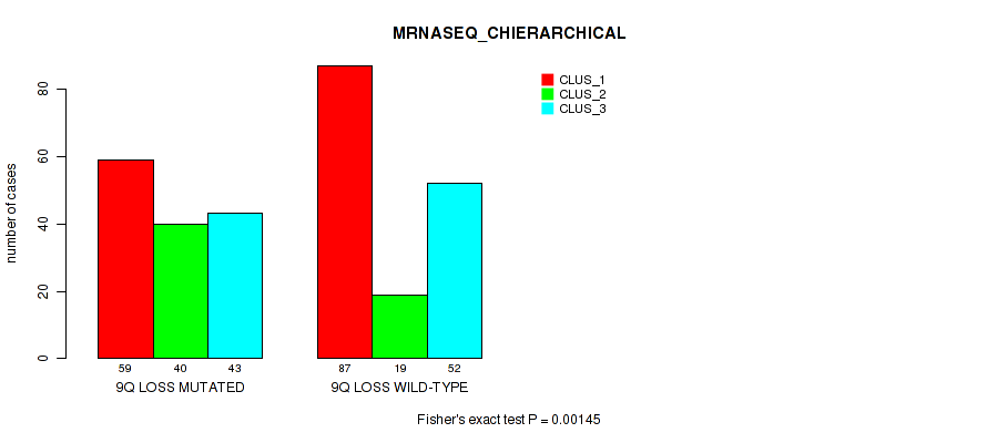 9q loss cnv correlated to 'MRNA_CNMF', 'MRNA_CHIERARCHICAL', 'MIR_CHIERARCHICAL', 'CN_CNMF', 'METHLYATION_CNMF', 'MRNASEQ_CNMF', 'MRNASEQ_CHIERARCHICAL', and 'MIRSEQ_CHIERARCHICAL'.