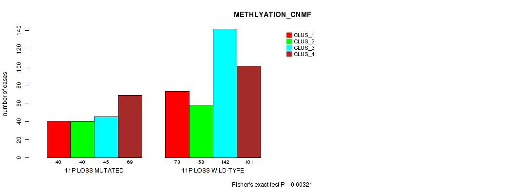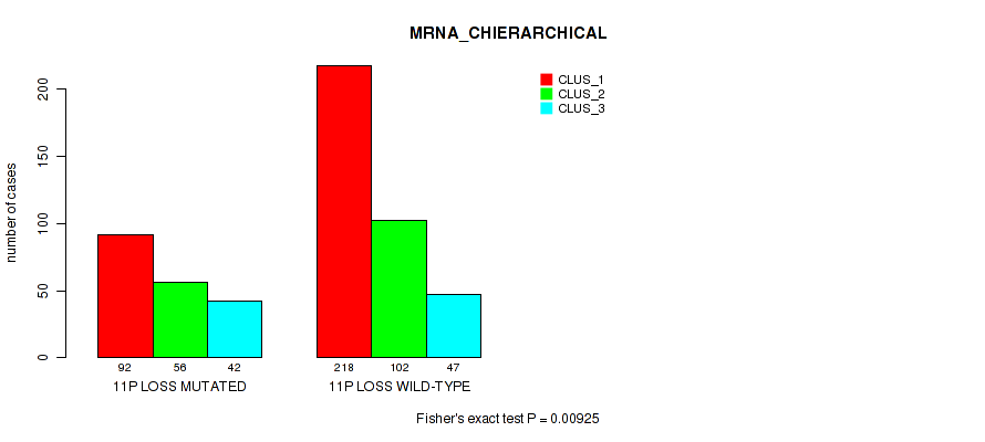 11p loss cnv correlated to 'MRNA_CNMF', 'MRNA_CHIERARCHICAL', 'CN_CNMF', 'METHLYATION_CNMF', and 'MIRSEQ_CNMF'.