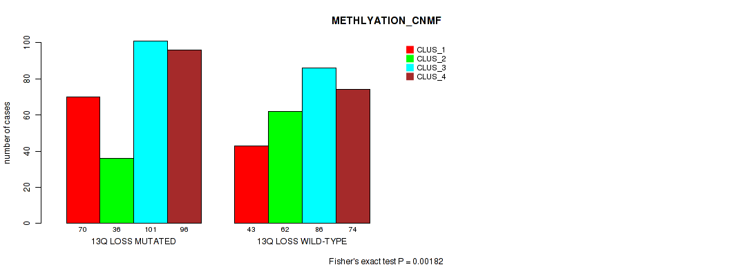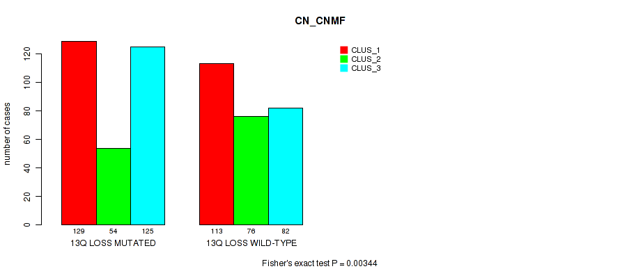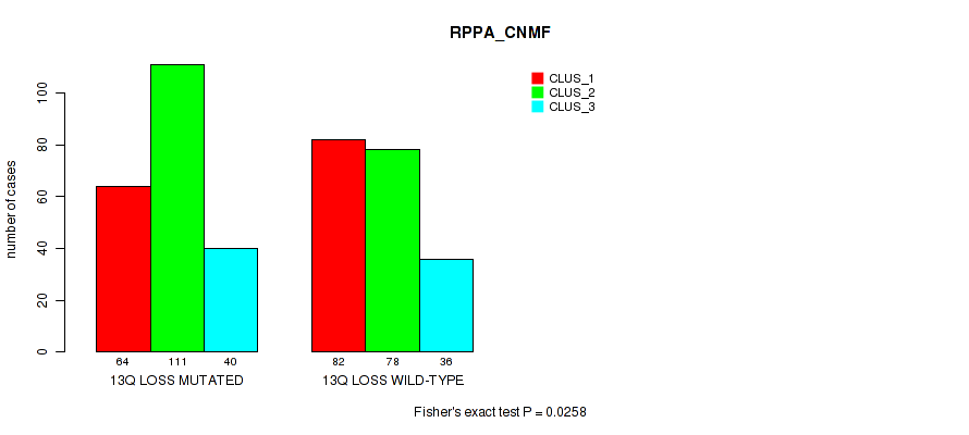 13q loss cnv correlated to 'MRNA_CHIERARCHICAL', 'MIR_CHIERARCHICAL', 'CN_CNMF', 'METHLYATION_CNMF', 'RPPA_CNMF', and 'RPPA_CHIERARCHICAL'.