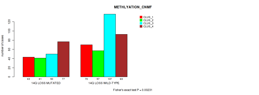 14q loss cnv correlated to 'CN_CNMF', 'METHLYATION_CNMF', 'MRNASEQ_CNMF', and 'MRNASEQ_CHIERARCHICAL'.