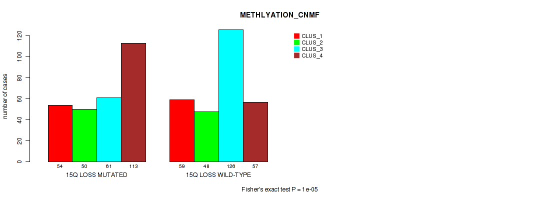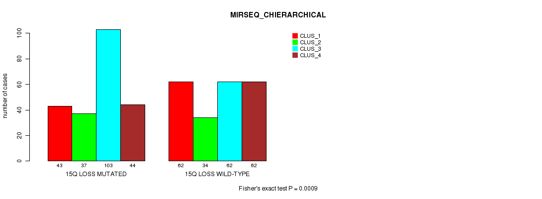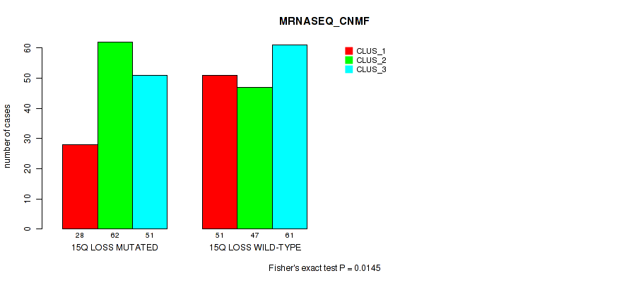 15q loss cnv correlated to 'MRNA_CNMF', 'MRNA_CHIERARCHICAL', 'MIR_CNMF', 'MIR_CHIERARCHICAL', 'CN_CNMF', 'METHLYATION_CNMF', 'MRNASEQ_CNMF', 'MIRSEQ_CNMF', and 'MIRSEQ_CHIERARCHICAL'.