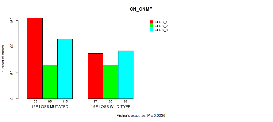 16p loss cnv correlated to 'CN_CNMF', 'METHLYATION_CNMF', and 'MIRSEQ_CHIERARCHICAL'.