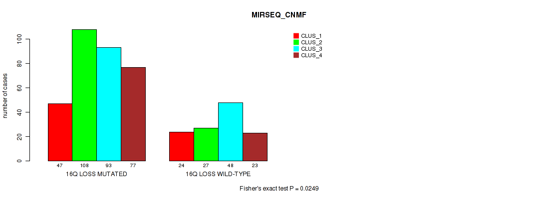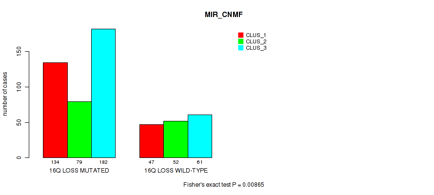 16q loss cnv correlated to 'MIR_CNMF', 'CN_CNMF', 'METHLYATION_CNMF', and 'MIRSEQ_CNMF'.