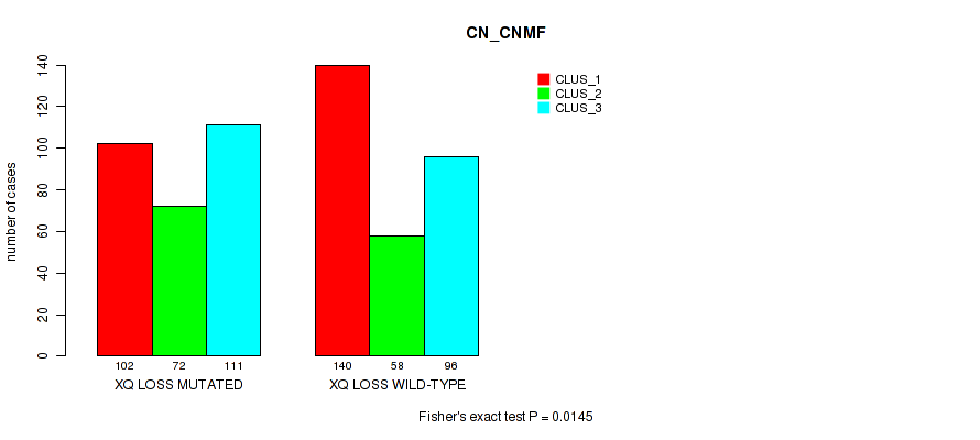 xq loss cnv correlated to 'CN_CNMF', 'METHLYATION_CNMF', and 'RPPA_CHIERARCHICAL'.