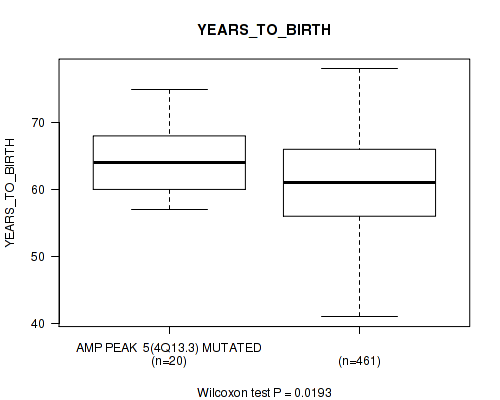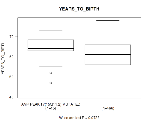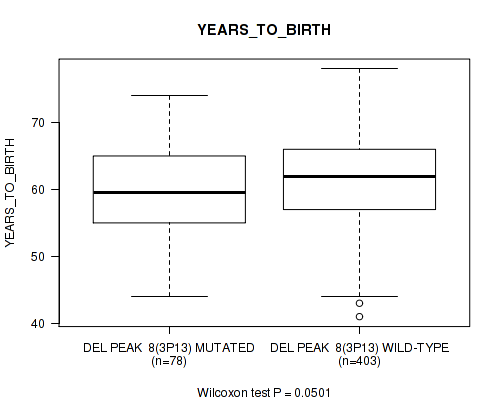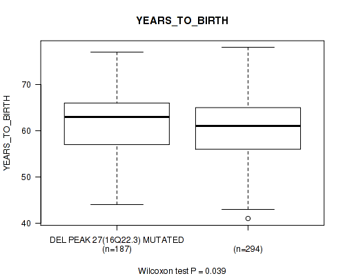 Figure S326. Get High-res Image Gene #61: 'del_19q13.2' versus Clinical Feature #2: 'YEARS_TO_BIRTH'