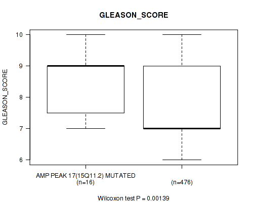 amp_17p11.2 cnv correlated to 'PATHOLOGY_T_STAGE', 'PATHOLOGY_N_STAGE', 'NUMBER_OF_LYMPH_NODES', and 'GLEASON_SCORE'.