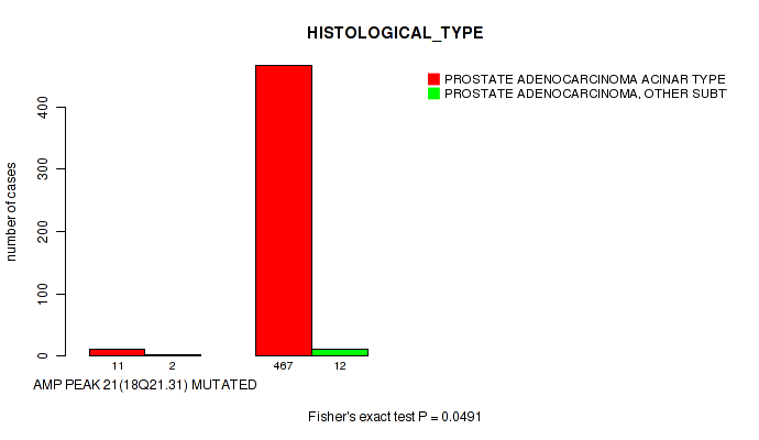 amp_18q21.31 cnv correlated to 'Time to Death', 'YEARS_TO_BIRTH', 'PATHOLOGY_T_STAGE', 'HISTOLOGICAL_TYPE', and 'GLEASON_SCORE'.