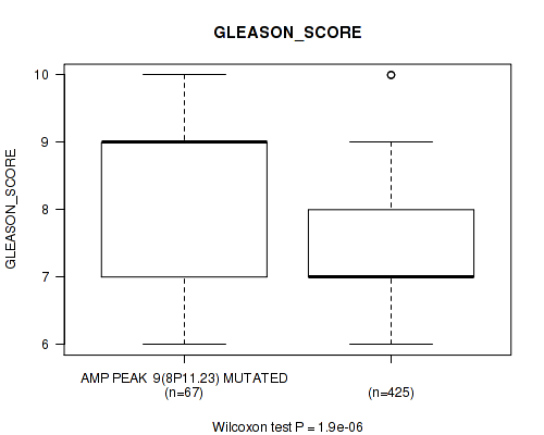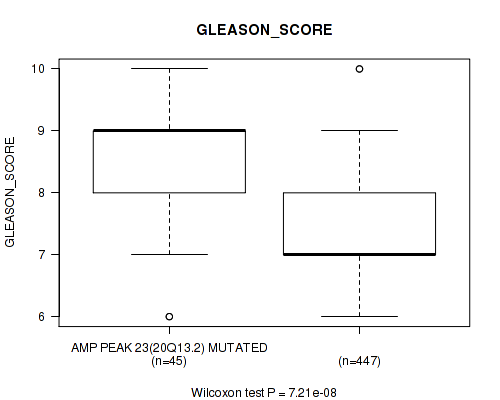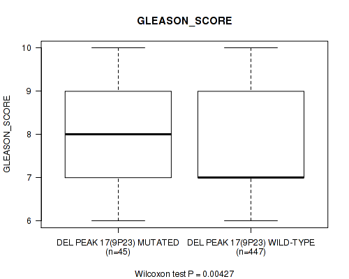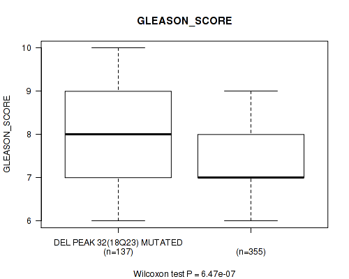 Table S323. Gene #60: 'del_18q23' versus Clinical Feature #9: 'GLEASON_SCORE'