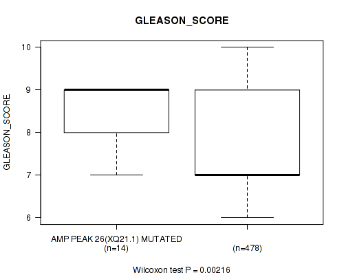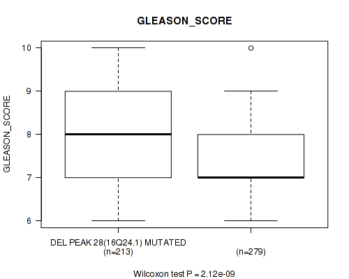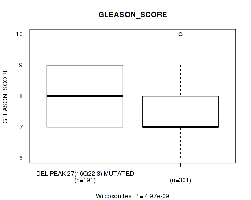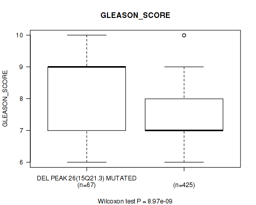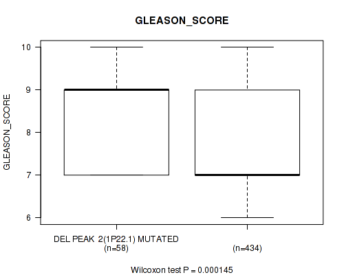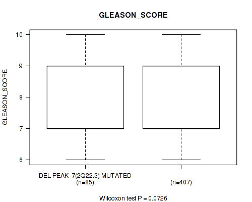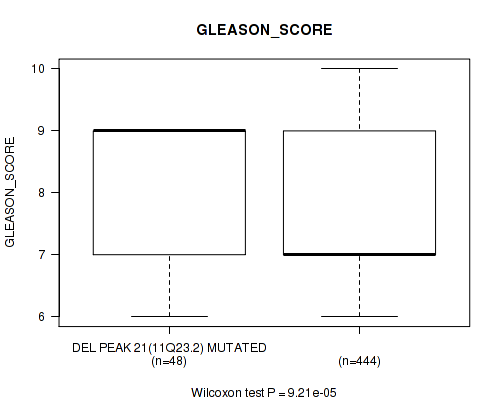 Figure S334. Get High-res Image Gene #62: 'del_21q22.2' versus Clinical Feature #9: 'GLEASON_SCORE'
