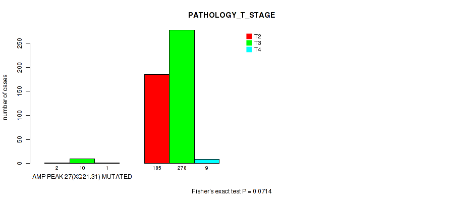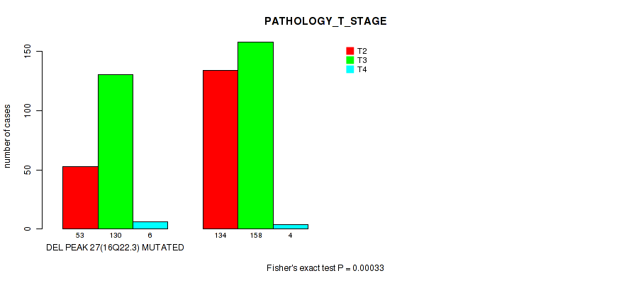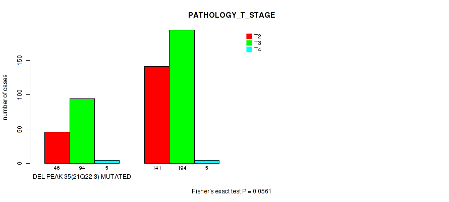 Table S330. Gene #62: 'del_21q22.2' versus Clinical Feature #3: 'PATHOLOGY_T_STAGE'