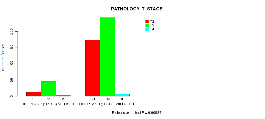 del_1p31.3 cnv correlated to 'PATHOLOGY_T_STAGE', 'RADIATION_THERAPY', 'RESIDUAL_TUMOR', 'NUMBER_OF_LYMPH_NODES', and 'GLEASON_SCORE'.