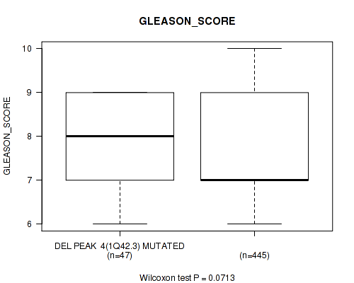 Figure S323. Get High-res Image Gene #60: 'del_18q23' versus Clinical Feature #9: 'GLEASON_SCORE'