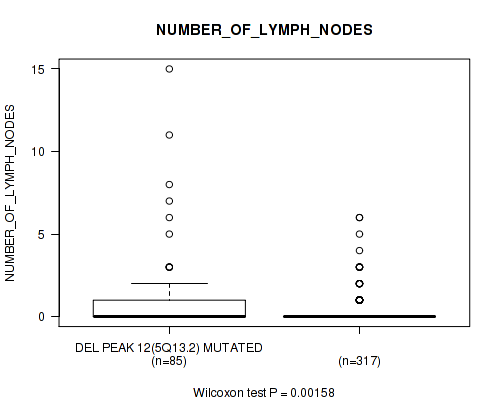 Figure S322. Get High-res Image Gene #60: 'del_18q23' versus Clinical Feature #8: 'NUMBER_OF_LYMPH_NODES'