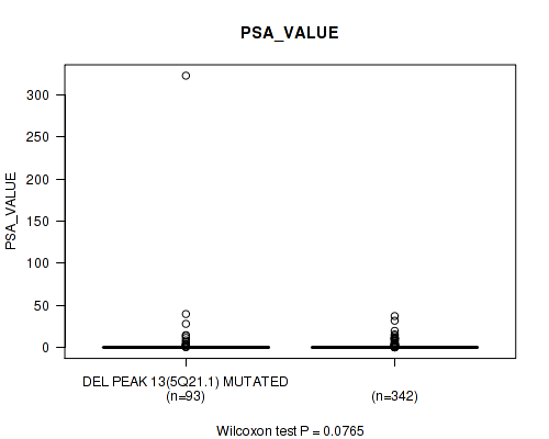 Table S324. Gene #60: 'del_18q23' versus Clinical Feature #10: 'PSA_VALUE'