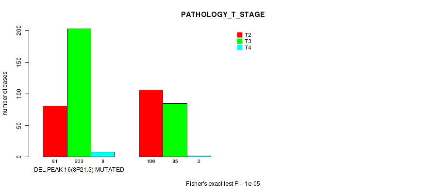 Table S336. Gene #63: 'del_21q22.3' versus Clinical Feature #3: 'PATHOLOGY_T_STAGE'