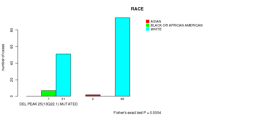 Table S335. Gene #62: 'del_21q22.2' versus Clinical Feature #11: 'RACE'